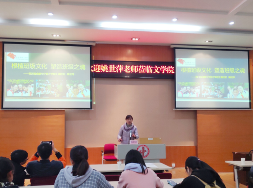 11月26日下午,我院在文学院办公楼213会议室举办了“我与名师面对面”教育教学学术讲座.“成都市优秀班主任”“锦江区优秀教育工作者”“锦江区师德先进个人”姚世萍应邀做题为《根植班级文化,塑造班级之魂》的主题讲座。文学院院长助理袁雪梅、教学办罗亮星、课程教学论教研室教师和汉语言文学专业部分学生到场聆听本次讲座。讲座由院长助理袁雪梅教授主持。