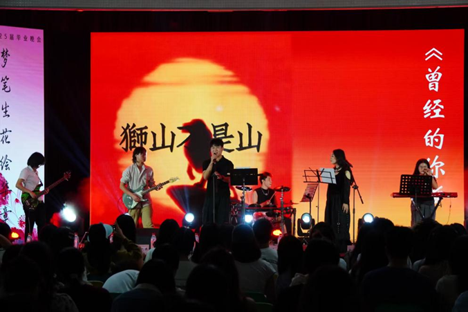 惊喜乐队“狮山不是山”带来暖场节目。结束后,一段由师生倾心制作的祝福视频点亮全场,饱含深情地传递了对毕业生的美好祝愿。随后,院长毛娟致辞,宣布本次毕业晚会正式开始。