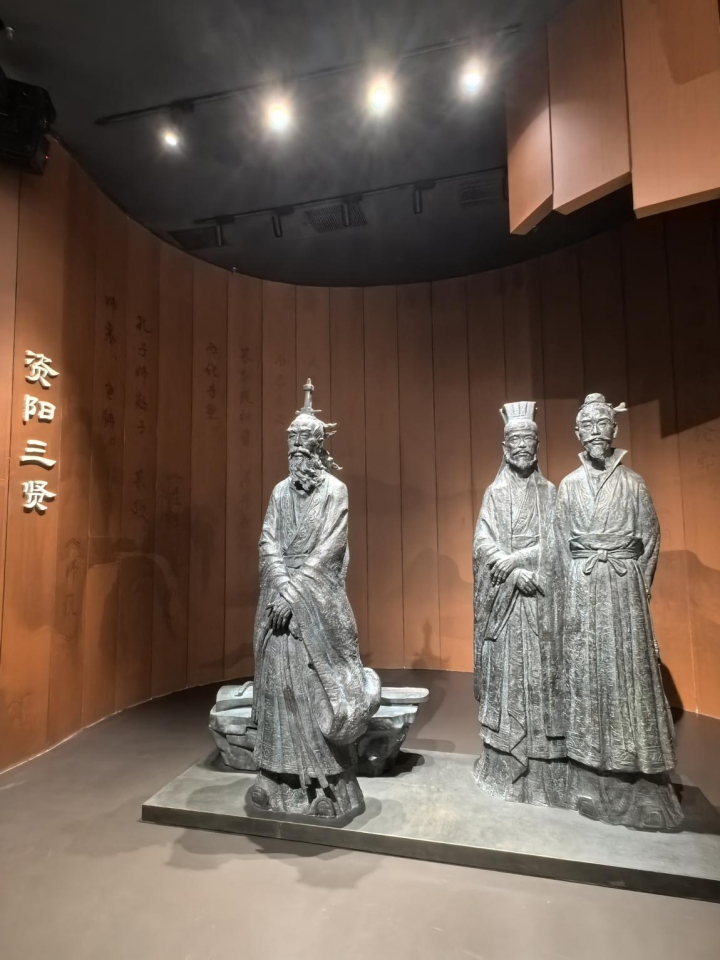 在资阳市博物馆的“车马汉风”“风华流芳”汉代文物展厅,王褒位于“三贤”雕塑,其雕像以“辞赋冠世”为设计核心,用流动衣纹模拟文思奔涌,材质表面隐现“书卷式”纹理,呼应其文学才情。服饰有别于董钧的庄重,广袖长袍束带轻垂,发冠简化为束发巾帻,弱化礼制符号,强化文人随性。展馆陈列着王褒墓出土的青铜带钩、漆耳杯等器物,具象化呈现王褒《僮约》中描绘的西汉社会图景。