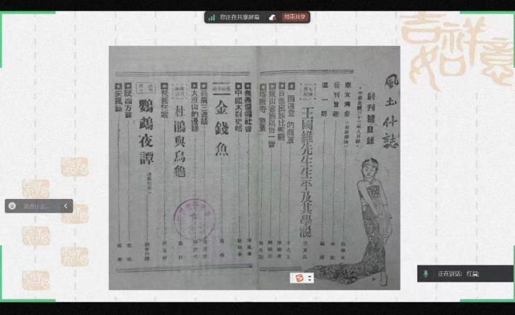 讲座伊始,赵老师便概述了她的整体研究框架。研究的核心对象是李劼人创办的《风土什志》,赵老师将研究内容细分为“风土和李劼人《风土什志》独具的特质”“《风土什志》的编辑思想与宏阔的视野”“《风土什志》的六大板块研究”“《风土什志》的研究模式、价值与意义”四个部分进行深入探讨。