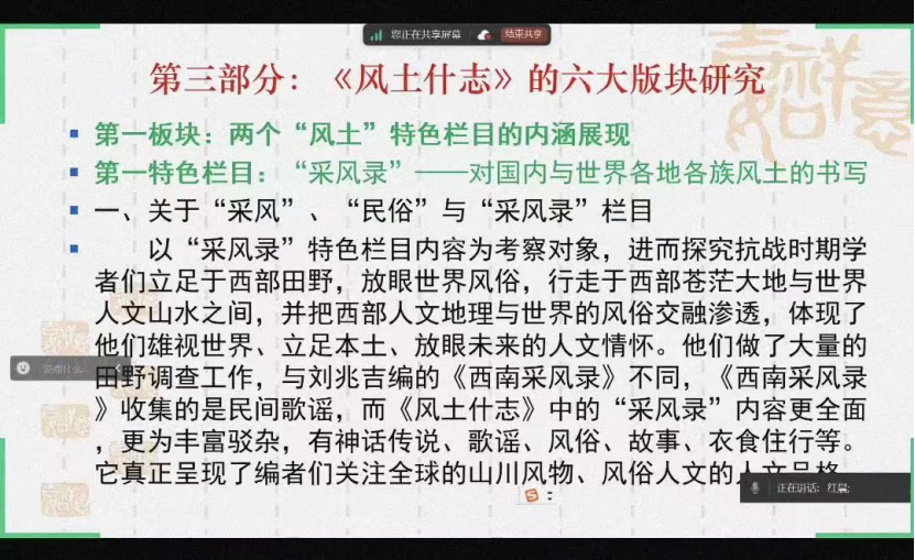 她首先介绍了第一板块,即两个“风土”特色栏目的内涵展现,其中包括了“采风录”和《天麓散记》。在第二板块,她探讨了对西部多地域、多民族多元世界风土的诗意阐释,强调了在多元语境下西南多民族文学的重要性,并指出这种多声部的共存如何拓展了文学的生存空间。她特别提到了西南的神话传说、民歌民谣、游记纪实等民间文学,它们各具特色、独具风情。第三板块,赵老师分析了李劼人《漫谈中国人的衣食住行》中的饮食观与人生观,指出饮食不仅是一个民族或地区文化的重要组成部分,也是民俗文化的体现。她阐释了李劼人在对四川“衣食住行”书写中的主题意蕴、思想主题以及隐藏在背后的情结与观念。在第四板块对两个“蜀中五老七贤”纪念特辑评书的讨论中,赵老师怀念了近代川渝的传统文人,悼念了赵尧、刘豫波先生的高节风骨。在第五板块,赵老师讨论了“学术考证”文章中“风土”的高度文化自觉”。第六版块中,她讲述了对国际风土与时事,包括了三个连载的特殊专栏:“波斯预言”栏目的《鹦鹉夜谭》、《风土什志》中的“《联合国速写》研究”,以及陈国桦“《亚洲少数名族问题讲座》”的文化传播与抗战情绪。最后,赵老师通过对《风土什志》中刊载的文章内容逐一梳理,结合文章发表的时代背景与刊物理念等综合论述,阐释了其独特价值与意义。阐释了其独特价值与意义。