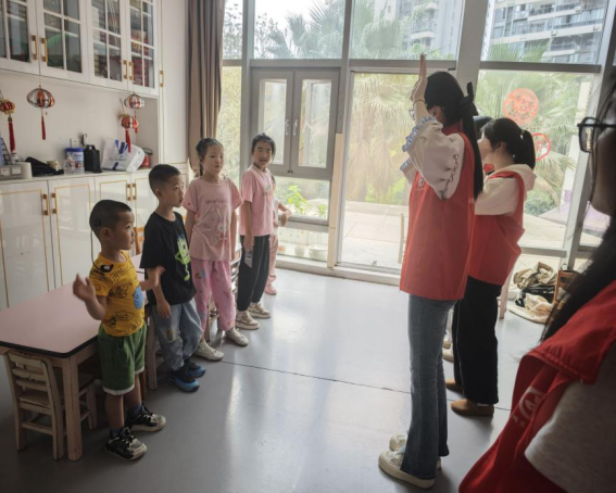 活动伊始,志愿者向小朋友进行了基本的自我介绍与问候,接着进行了《小美满》手势舞教学活动。教学中,孩子们跟随节奏学习手势舞,指尖翻转间传递欢乐,笑容洋溢在稚嫩脸庞。趣味肢体语言破冰活动拉近了志愿者与孩子们的距离,为现场注入了温暖活力。