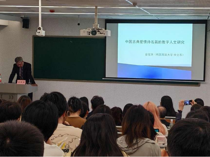 数字人文技术解码古典爱情,跨文化视角探寻诗韵共鸣。2025年4月25日15:30,文学院学术讲座“对中国爱情诗名篇的数字人文分析”在四川师范大学狮子山校区第二教学楼201教室如期举行。本次讲座特别邀请韩国高丽大学中文系金俊渊教授作为主讲嘉宾,金教授紧扣“对中国爱情诗名篇的数字人文分析”这一核心主题,展开了一场兼具技术与文学的学术讲座。此次讲座由四川师范大学王红霞教授主持,文学院共计100余名师生参加。
