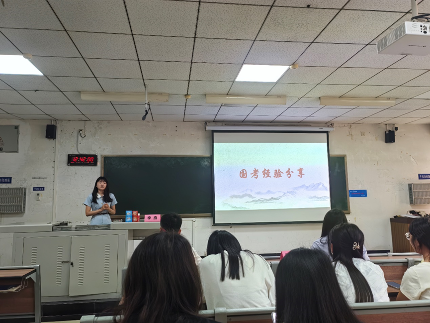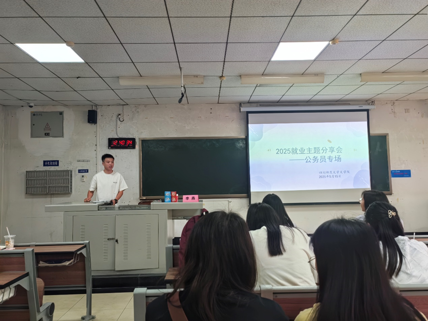 5月15日12:30,四川师范大学文学院于7教102教室举办“2025就业主题分享会——公务员专场”学长沙龙活动。活动邀请2022级中国语言文学专业硕士研究生李燕、谢琳璐担任主讲,近百名同学参与了本次活动。