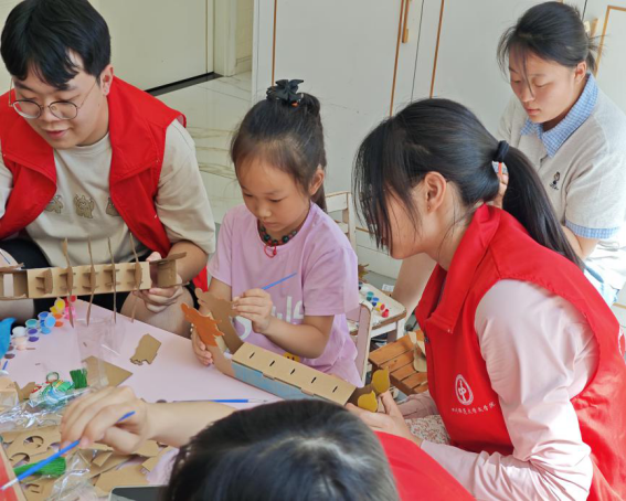 随后,志愿者带领孩子们开启两项手工创作环节。首先是多彩龙舟制作。志愿者为孩子们分发龙舟 DIY 材料包,全程一对一耐心协助。从零件的拼接到色彩的涂抹,孩子们在志愿者的帮助下充分发挥自己的想象力,为龙舟披上了五彩斑斓的“外衣”。龙舟虽小,却承载着孩子们对传统文化的好奇与探索。