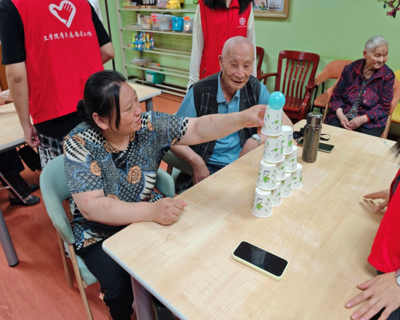 一套一叠,纸杯套出创意温情。在“纸杯套娃”趣味活动中,志愿者们全程悉心协助,积极引导老人参与,尽情感受游戏的丰富乐趣,是关爱从“单向给予”转为“双向互动”的生动体现。通过这一益智游戏,老人们的认知功能提升,身体机能得到锻炼,同时也促进了两代人的情感沟通与交流。