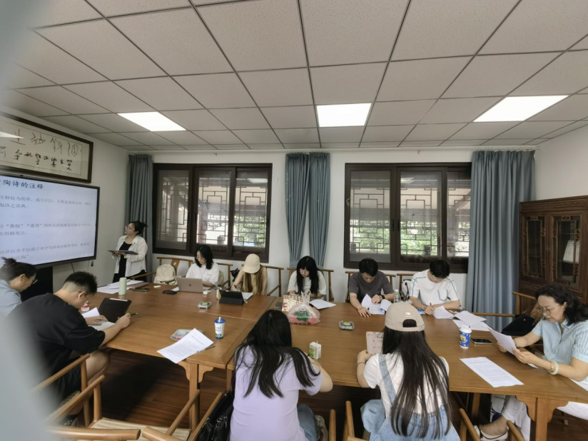 2025年6月3日13时30分,王红霞导师组在中华传统文化学院二楼会议室召开本学期第四次“悦读”读书会。本次会议由王红霞教授主持,具体参会人员包括古代文学和古典文献学专业的9名硕士研究生和4名博士研究生。此次读书会由2024级硕士于杰婷同学分享她对所读论文的心得体会,论文名为《陶渊明与苏轼和陶诗研究的新资料——韩国新见<精刊补注东坡和陶诗话>两种考论》。