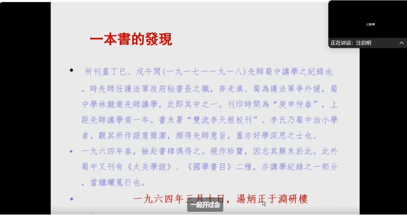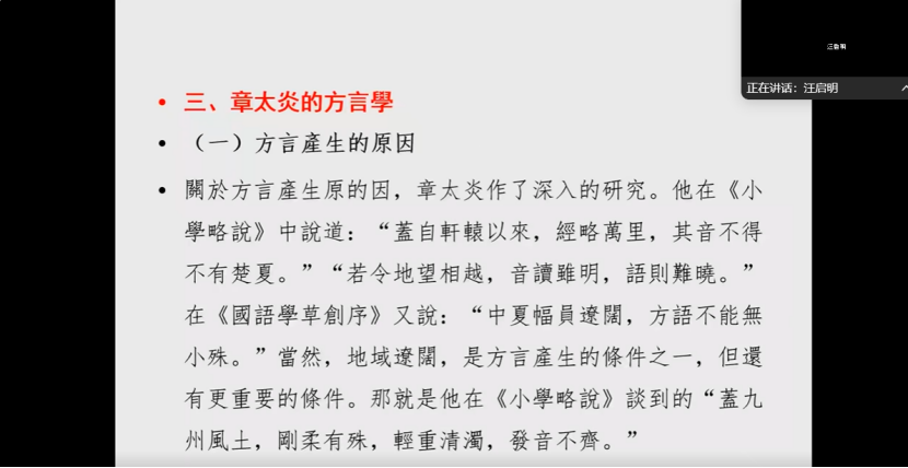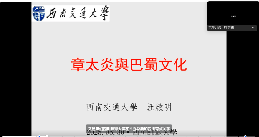 2025年5月30日9:00,文学院主办的“蜀山讲坛”第十七期十五讲《章太炎与巴蜀文化》在腾讯会议如期举行。本次讲座由西南交通大学汪启明教授主讲,四川师范大学文学院王振副教授主持。文学院各专业本科生、研究生及相关专业教师共200余人聆听了本场讲座。
