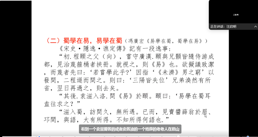 紧接着,汪教授高度评价蜀地易学、医学的早期成就,推介三星堆文明遗存。汪教授将蜀易学分为三类:探究宇宙本源的“天道”派(原始道教渊源)、注重延寿的“养生”派、融合佛禅的“辅政”派,同时解析《周易》核心思想——阴阳法则、中庸之道、自强不息、厚德载物及循环规律(如物极必反),认为其契合现代环保科学理念。