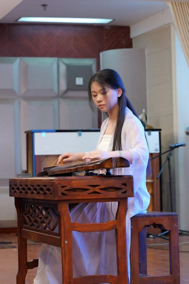 5月28日,“四川省川派古琴学会专场音乐会”在成都市锦江区文化馆举行。本场音乐会是2025国际古琴艺术周重要专场演出之一,川派古琴学会多家会员单位齐聚一堂,同台献艺,展现蜀中琴学传承发展盛况和川派古琴艺术的独特魅力。四川师范大学古琴社作为会员单位受邀参演。音乐会上,川师古琴社成员温海琳演奏川派经典琴曲《石上流泉》。该曲取材自然,表现泉石动静相生之态,蕴含仁智交融的哲理。和畅古朴的琴音让听众宛如步入“明月松间照,清泉石上流”的诗画之境,赢得在场听众的共鸣和热烈掌声。本次活动不仅为川师古琴社提供了宝贵的实践平台,助力弘扬古琴艺术,同时也展示了琴社的风采,体现学校美育文化特色和成果。