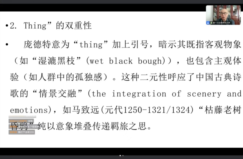 此外讲座还探讨了翻译挑战,如“apparition”的幽灵感与中文虚词处理,并联系一战前欧洲精神焦虑与康德哲学,阐释接受史的多维性。理论延伸部分,结合克罗齐“意象-情感”论,指出庞德以冷抒情传递现代性复杂情绪,并呼应中国当代诗歌实践与短视频时代的“瞬间美学”。