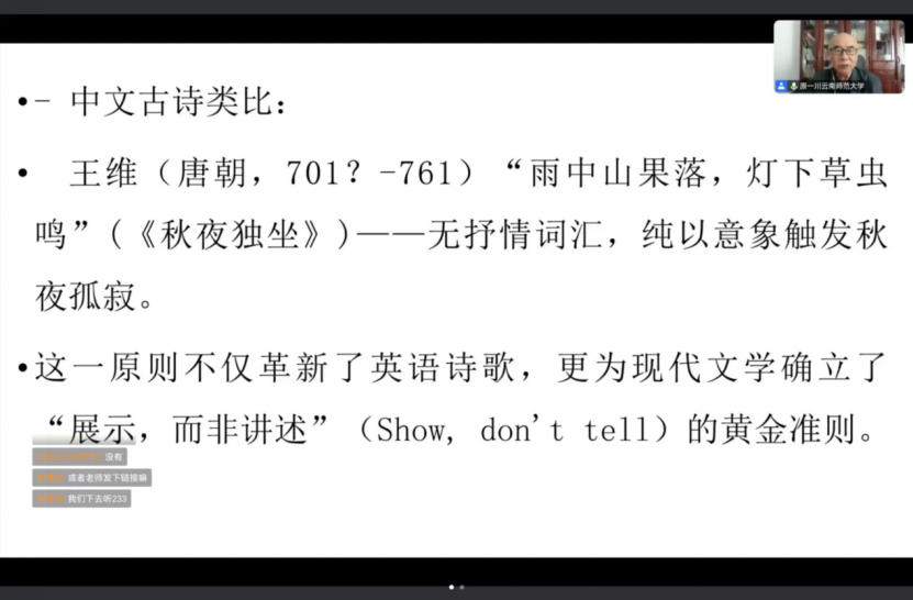 2025年6月7日9:00,应四川师范大学文学院的邀请,云南师范大学原副校长、云南师范大学外国语学院二级教授原一川在腾讯会议为文学院师生作了一场题为“庞德《在地铁站》的意象美学与跨文化阐释”的学术讲座,四川师范大学文学院部分教师、博士研究生、硕士研究生、本科生近四百人参与讲座,四川师范大学文学院教授、比较文学与世界文学学位授权点建设负责人张叉主持讲座。