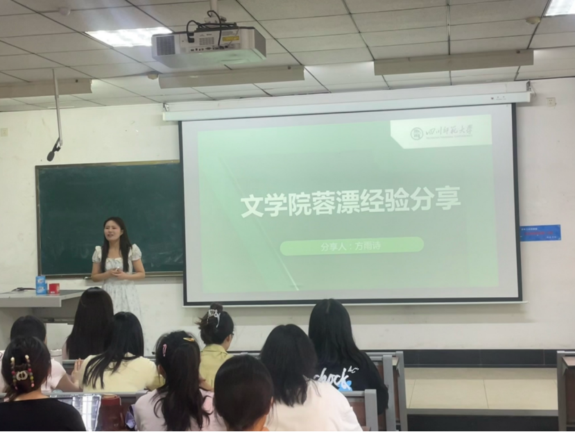 活动伊始,由“蓉漂”上岸的方雨诗率先分享。她主要从“蓉漂”的前期准备工作以及自身面试经历、面试技巧两方面展开分享。方雨诗结合自身面试经历,以“蓉漂”前期准备工作为引入,详细介绍了“蓉漂”的具体流程。她提到,在面试前的准备工作至关重要,简历制作应结合自身优势,突出自己实习经历与学术科研优势。此外,她详细分享了自己参加锦江区“蓉漂”面试中试讲、说课、笔试、校长面谈等环节的经验,并提醒学弟学妹们需熟悉最新教育热点和新课标,在面试过程中应时刻保持自信。