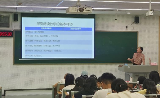 随后,唐老师从多个维度对深度阅读进行了细致剖析。唐老师提出,阅读意义在层次上主要分为知识层次与生命层次两个方面。知识层次的意义源于学生对语言符号的解读,具体涵盖语言性质与规律、写作来源与目的等五个方面;而生命层次的意义则聚焦于学生自我认知与改造,包括意识与需要、情感与兴趣等内容。这两个层次相互交融、相互渗透,共同构建起学生丰富的意义世界。唐老师还通过对比深层阅读教学与浅层阅读教学,向听众展示深度阅读教学的特点。她指出,在教学目标层面,浅层阅读往往侧重于知识技能的传授,却容易忽视学生情感态度与价值观的培养;而深度阅读则着眼于全方位提升学生的人生素养,致力于促进学生的全面发展。从教学内容来看,浅层阅读通常止步于知识的表面,致使文本呈现碎片化状态;相比之下,深度阅读则深入知识内核,注重知识之间的关联性,并大力倡导整本书阅读。在教学过程与方式上,浅层阅读多受外部压力驱动,问题呈现简单叠加的态势,学习内容与现实生活脱节严重;而深度阅读则是学生自发的内源性建构过程,通过综合性活动带动学习,紧密联系课内课外知识,积极开展混合学习模式。就教学结果与功能而言,浅层阅读属于知识接受式教学范畴,学生对知识的记忆往往较为短暂;而深度阅读则是意义建构教学,具备长久的育人功效,能够使学生对所学知识记忆深刻、历久弥新。