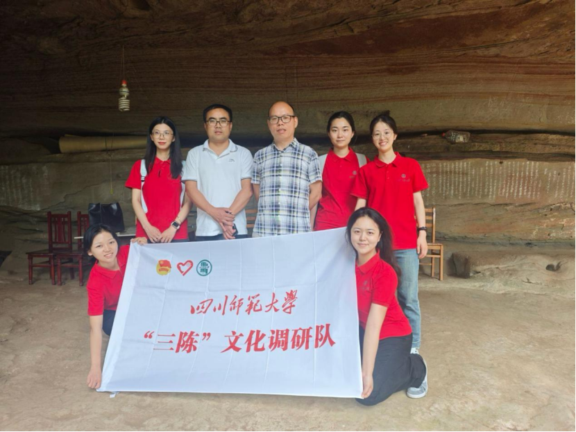 为深入挖掘和保护四川历史名人文化资源,传承与弘扬中华优秀传统文化,实现优秀传统文化的化人、育人价值,四川师范大学文学院熊倩、魏雅静、李思遥、何锦婷与服装与设计艺术学院陈怡伶五位同学在文学院叶军副教授的指导下,组建“三陈”文化调研队(“三陈”即北宋陈尧叟、陈尧佐、陈尧咨三兄弟),并前往南充市南部县大桥镇调查收集“三陈”历史名人资源,以期系统挖掘、传承并弘扬“三陈”文化。团队先后走访了瑞笋堂、漱玉岩等与“三陈”文化相关的文化地标,并对“三陈”文化研究员衡立峰老师进行了采访,随后整理相关资料,在当地学校开展“三陈”文化主题课程,进行宣传普及活动。团队通过实地调研、专家访谈和校园推广,进一步探索并弘扬“三陈”文化。