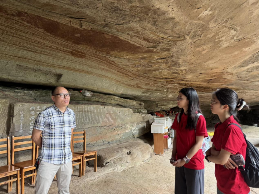 7月9日,团队跟随“三陈”文化研究员衡立峰老师以及袁玮校长共同前往“漱玉岩”进行深入调研。衡老师向团队介绍,这座位于大桥镇的天然岩洞,因岩顶常年有清泉滴落,其声如玉佩相击而得名“漱玉”。这里是“三陈”小时候读书的地方,其洞顶有石锁,为“陈氏三状元”效法孙敬和苏秦“头悬梁、锥刺股”所留。洞内岩壁上有不少文人墨客的题刻,至今保存完整。团队成员借助设备,对这些珍贵的历史遗迹进行了影像记录。