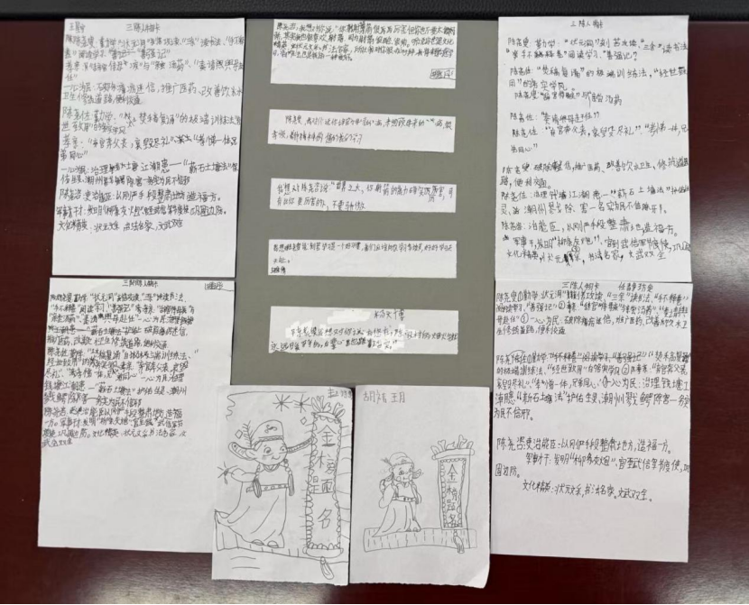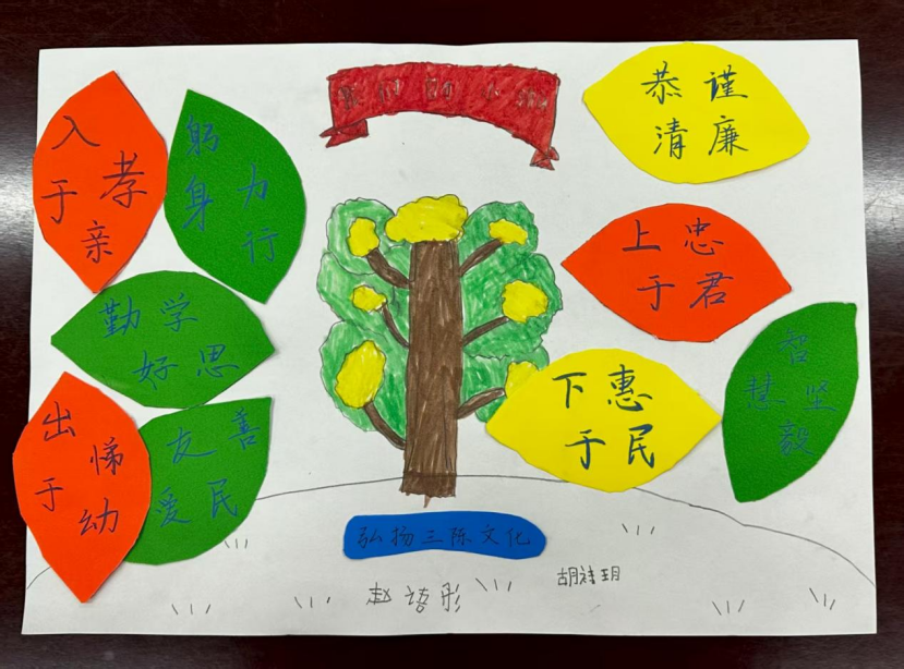 在课程上,团队成员生动讲解了“三陈”的成长故事和为官事迹,并特别设置了“三陈”人物卡片制作的环节。学生在团队成员指导下,亲手绘制“三陈”生平事迹和名言警句的卡片,在动手实践中加深理解。此外,团队成员带领学生回顾“三状元”的经历,指导学生将写有孝顺、坚持、智慧等精神品质的树叶贴至绘制的树木树干上,完成“三状元”精神树图画。