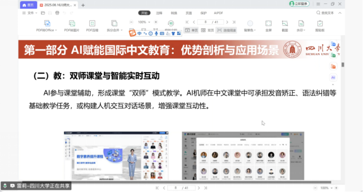 四川师范大学文学院院长毛娟教授、韩国延世大学中国研究院院长金铉哲教授在开幕式中致辞。四川大学海外教育学院雷莉教授作了题为《AI赋能教学评价与改革—以国际中文教学改革实践探索为例》的主题报告,报告结合人工智能技术与国际中文教育改革的实践案例,深入探讨了如何利用数字化工具推动教学评价与改革。