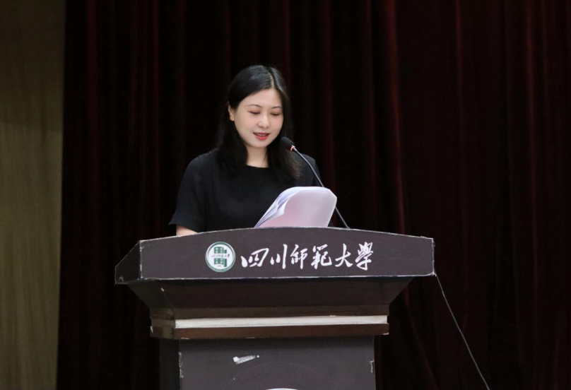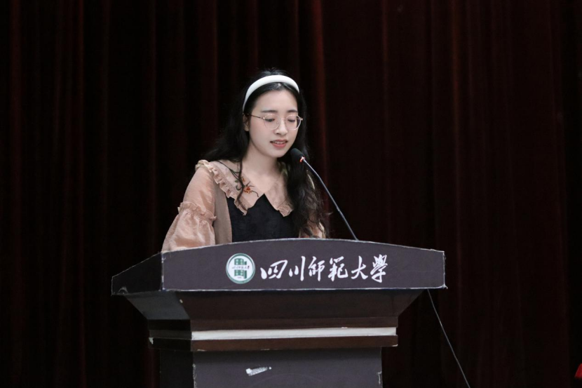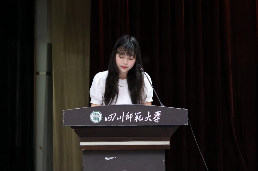 随后,在校研究生代表、2023级中国现当代文学专业硕士研究生李扬发言。她回顾七年在文学院的求学时光,形容学院如“暗夜炬火、荒原灯塔”。她表示,在文学院不仅学到了专业知识,更获得了精神滋养。她鼓励新生勇于寻找方向,并借此教师节向老师们表达感谢,同时呼吁大家以青春同行,共迎川师八十华诞。