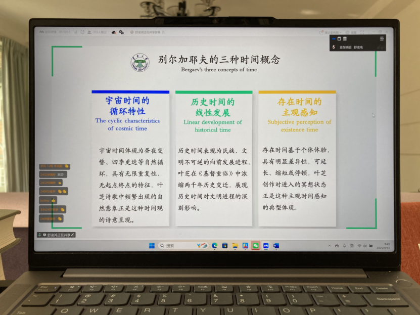 舒凌鸿指出叙事学跨文体研究的基础、必要性和可行性,总结了现代主义诗歌在文学领域的贡献,探讨了历史时间、循环时间与存在时间在诗歌中的交融机制,并特别聚焦于抒情诗歌中显著的“重复性”特征与其时间叙事之间的内在联系,并从四个层面展开此次讲座内容。