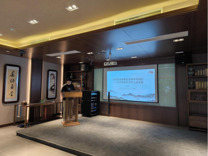 本次活动在杜甫草堂的观澜堂举行,主题为“新诗文本细读”。主要报告人有两位:西南交通大学人文学院博士研究生黄舜,和四川师范大学文学院博士生刘铮。