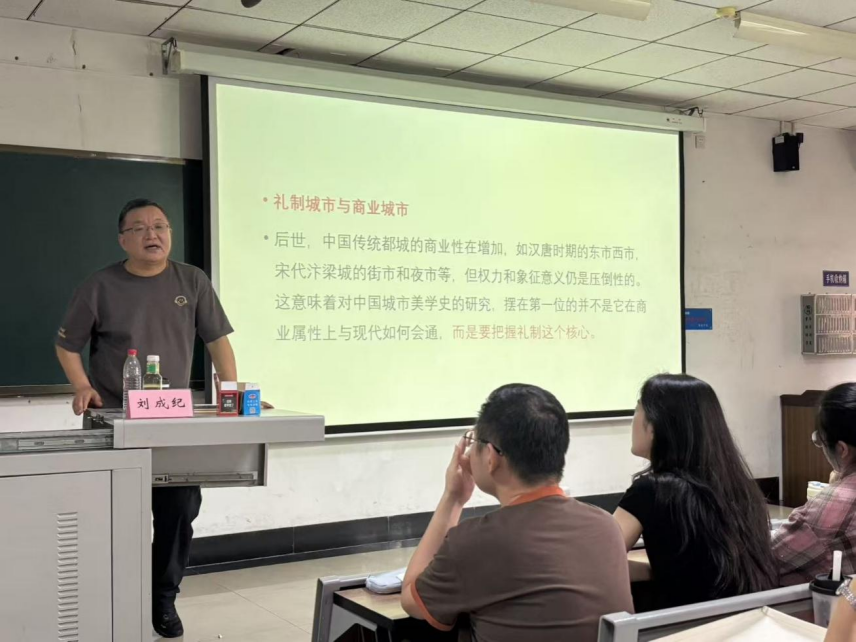 讲座伊始,刘成纪教授介绍了中国美学研究领域现有的局限,即存在本质主义倾向与建构性理论的缺陷。对此问题,刘教授指出,应当放弃构建中国美学史的理论企图,直接从中国历史本身挖掘美学基础,提出从“审美地理学”“农耕文明”与“城市视角”三个维度重新理解中国美学的理论路径。