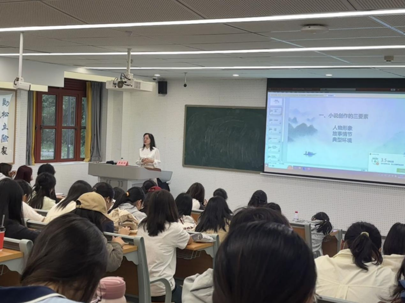 随后,李老师以作家李娟的散文集《我的阿勒泰》改编电视剧为例,分析了电视剧为改编小说所做的调整与改动,从而对小说创作的三要素:人物形象、故事情节及典型环境展开具体论述。在人物形象与典型环境的创作方面,李老师巧妙地以数学理论的实际运用为例,以热门“IP”《西游记》的架空背景和主要角色创新性改编为立足点,阐述了人物形象塑造以及环境设定在一部文学作品中的基础性作用;在故事情节方面,李老师以《呼啸山庄》为例,重点分析了小说中的“复仇”模式因情节的跌宕性而对读者产生的特殊吸引力,从而引入小说创作的重中之重——矛盾设置。
