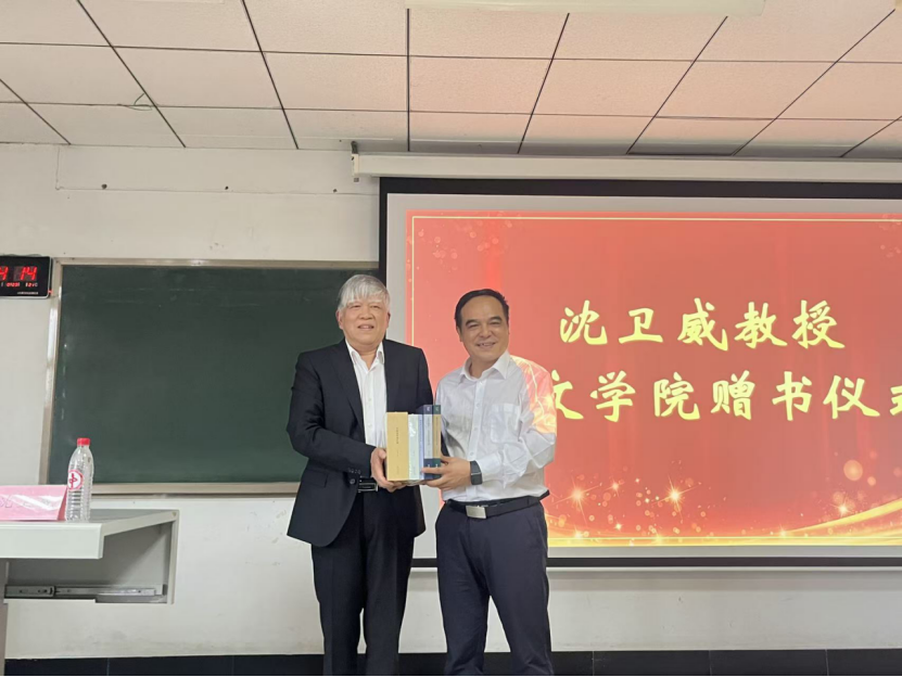 2025年10月20日下午4:00,文学院学术讲座在7教503教室如期举行。本期讲座嘉宾是南京大学沈卫威教授,主题是:现代文学史研究的档案路径。本次讲座由文学院袁昊老师主持,文学院各专业部分本科生、研究生及相关专业教师聆听了本场讲座。在讲座进行之前,沈卫威教授向文学院赠送他新近出版的专著五本;文学院副院长谭光辉教授代表学院接受了沈教授的赠书,并向沈教授致以热诚的谢意。