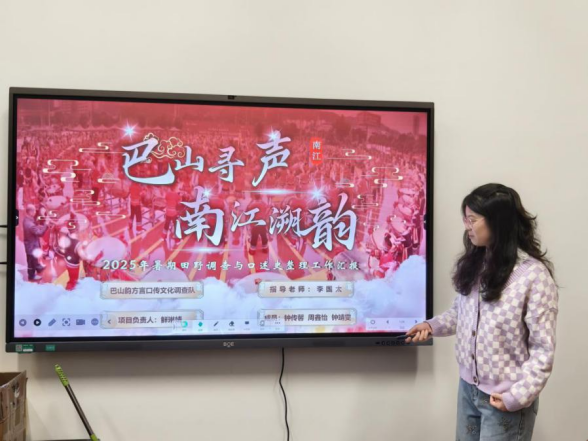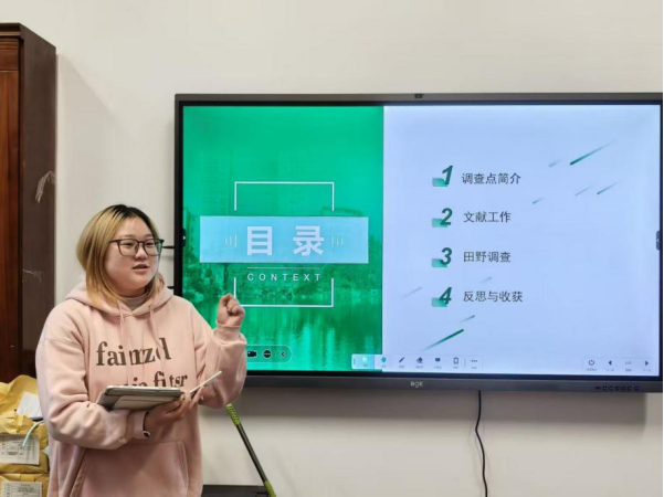随后,由2024级中国少数民族语言文学专业硕士生汤小慧分享了犍为县方言口传文化田野调查个案,内容包括调查点简介、文献工作、田野调查、反思与收获四个方面。报告当中着重强调了沟通的重要性,无论是队内成员沟通还是与发音人的沟通都需要做到及时有效,同时指出需要及时调整好心理预期与实际情况的反差。此次实践初步建成“犍为片区方言口传文化数据库”,实现了成果的数字化保存,并深刻体会到田野调查不仅是资料搜集的“工作场”,更是与地方建立深厚情感的社交空间。
