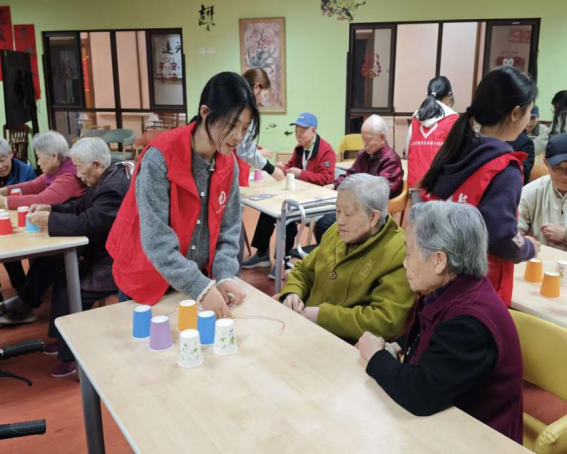 接着是考验配合的协作小游戏。在志愿者的带领下,两位老人被分为一组,他们需要用皮筋夹起纸杯,再将相同颜色的纸杯摞起来。这项任务看似简单,却极考验彼此的默契与耐心。当纸杯被稳稳夹起,成功摞到同色“杯塔”上时,喜悦与成就感洋溢在每位老人的脸上。现场欢笑声、鼓励声此起彼伏,老人们在妙趣横生的互动中,不仅锻炼了手眼协调能力,更深深体会到了信任与配合带来的快乐。