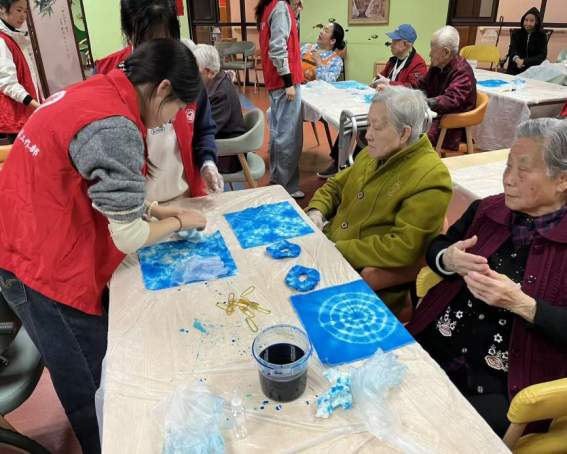 压轴环节是创意扎染,将文化韵味与动手乐趣完美融合。志愿者将扎染的千年技艺娓娓道来,随后一对一耐心协助老人创作。从折叠、捆扎到染色,每一步都充满新奇与乐趣。不一会儿,一幅幅色彩斑斓、图案独特的扎染方巾陆续诞生,老人们爱不释手,成就感溢于言表。