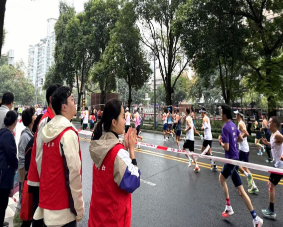 传统隔离易形成视觉疲劳,志愿者们用连续不断的口号形成“声浪护栏”,既提醒跑者注意弯道,也有效避免了观众穿越赛道。他们以青春之力守护赛事安全,赛道沿线未发生一起因观众闯入导致的减速事件。直至上午10点,随着最后一名跑者通过锦江赛段,志愿者们才开始有序撤离,清理岗位物资并协助恢复交通秩序。