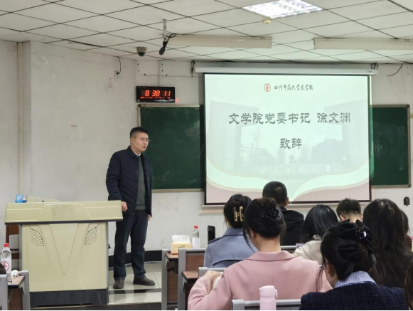 决赛正式开始前,文学院党委书记徐文渊为大赛致开幕辞。他首先代表学院向晋级选手表示祝贺,并向莅临指导的各位评委专家及为大赛付出辛勤劳动的筹备师生致以诚挚感谢。徐书记回顾了文学院发展历程,指出“春华杯”历经十八载,已成为学院坚守育人初心、传承师范精神的重要载体。他强调,语文学科是传承文化、立德树人的核心阵地,语文教师肩负着“为党育人、为国育才”的时代使命。他进一步指出,在当前国际格局深刻变化的背景下,语文学科更承载着讲好中国故事、塑造国家文化形象的重要功能。他勉励选手将专业功底、教学智慧与家国情怀融为一体,赛出风采、展现担当。