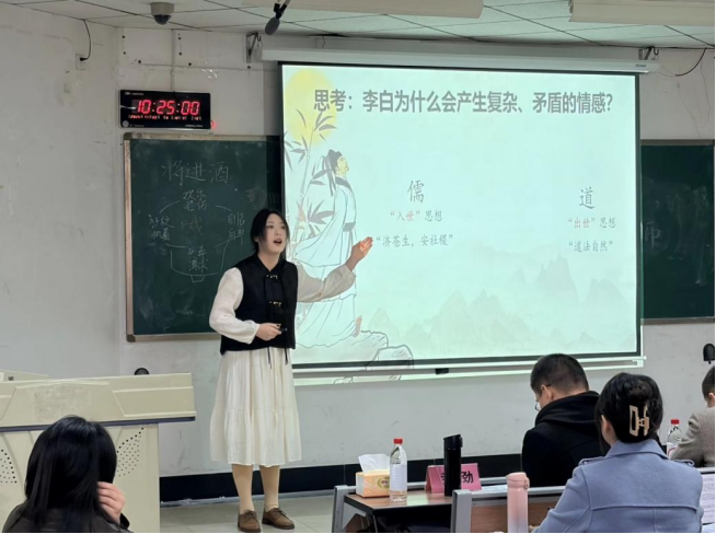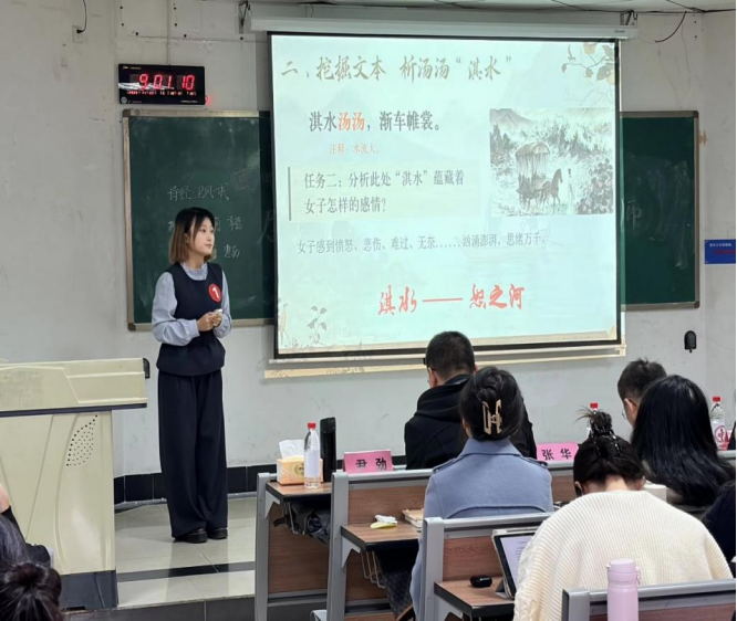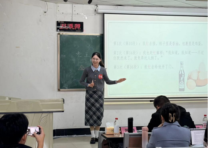 决赛现场,16位选手依次登台,在八分钟的微型课堂中各展所长。从《故都的秋》的悲凉意蕴到《老王》的深刻愧怍,从《氓》的古典叙事到《鹊桥仙》的浪漫情怀,再到《与妻书》的家国大爱,选手们或引经据典、深入浅出,或创设情境、循循善诱,展现出扎实的文本解读能力、创新的教学设计与成熟的课堂驾驭能力,充分体现了文学院研究生坚实的专业功底与良好的师范素养。