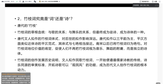 讲解过程中,朱老师结合清代文人创作的竹枝词实例,深入剖析清代中期竹枝词的市井化倾向。通过展示相关作品,帮助听众理解竹枝词蕴含的乐府传统与声乐传统,以及竹枝词反映的社会大众生活细节。