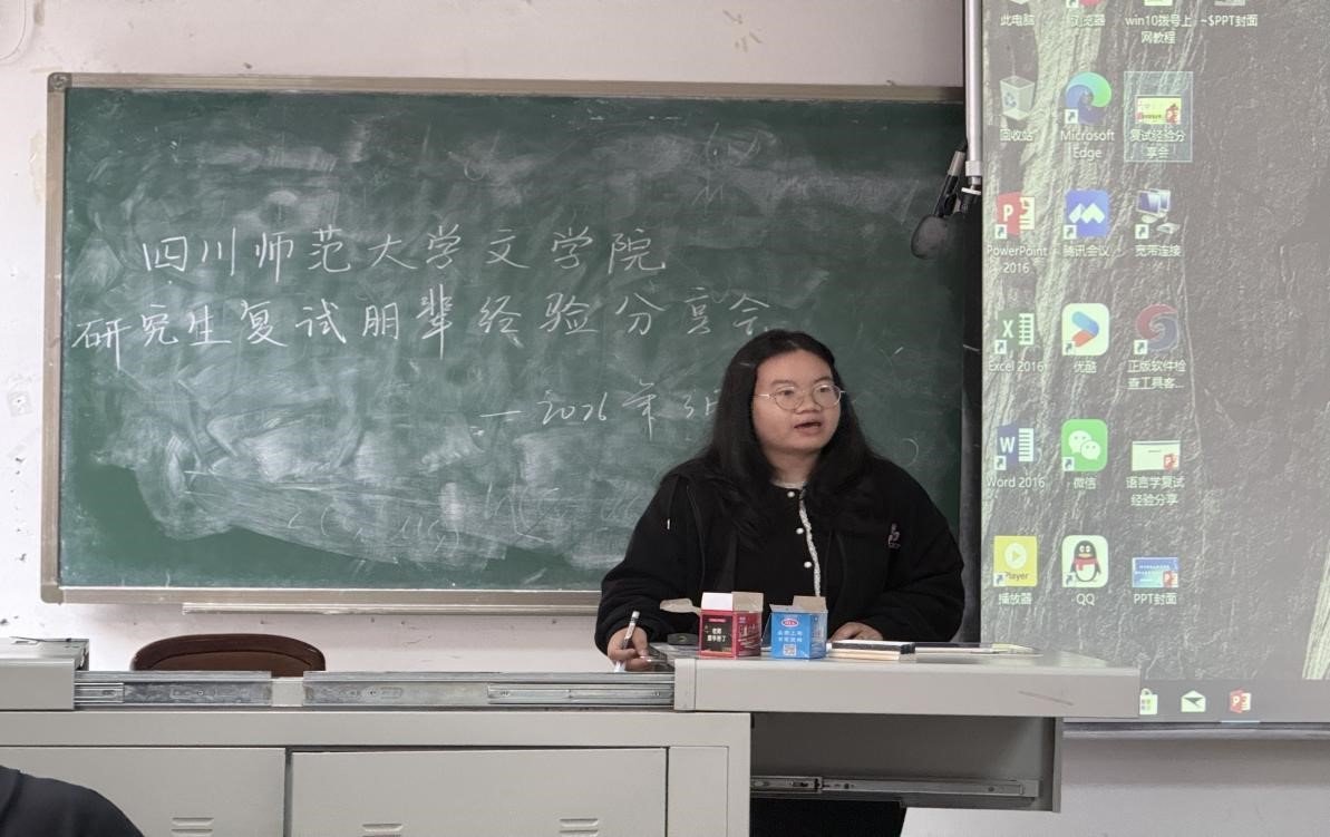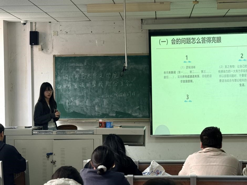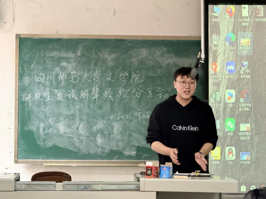 随后,四位同学依次进行了分享。2025级学科教学(语文)陈尹同学全面拆解了复试流程,详细介绍了笔试、英语考核与综合面试等核心环节,并结合自身备考经历,从教材准备、英文简历精简、试讲技巧等方面给出可直接落地的实用建议,同时贴心提醒同学们注意复试期间着装得体、饮食健康及考后注意事项,为复试备考提供了全方位指引。