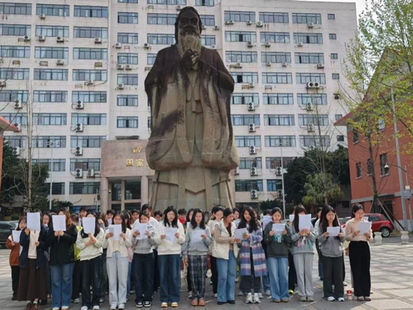 活动伊始,同学们在孔子像前整齐列队,在庄重肃穆的氛围中开启了户外诵读环节。领诵人带领全班同学齐声诵读清明主题的经典诗文。朗朗书声回荡在校园中,传递着同学们对清明节气的文化感悟。