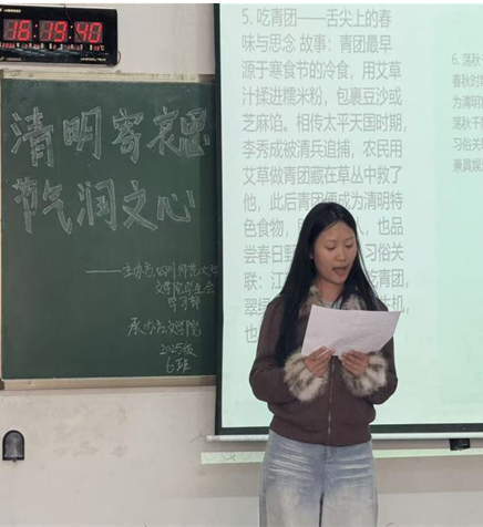 清明已至,烟雨濛濛,气清景明。清明,是二十四节气中的第5个节气,是仲春与暮春的交汇。它既是自然节气点,也是传统祭祖节日,兼具扫墓追思与踏青迎春的双重内涵,标志着万物吐故纳新、春和景明的时节正式到来。2026年3月24日,四川师范大学文学院2025级6班开展了二十四节气——清明经典诵读活动。该活动旨在通过多元的呈现方式,引领同学们体悟节气中的人文情怀,加深对中华优秀传统文化的了解,营造浓厚的校园文化氛围。