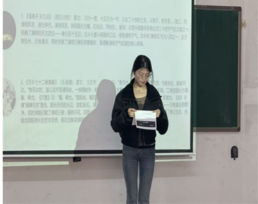 随后,同学们移步至教室,开启室内沉浸式节气传统文化体验。“清明小课堂”中,主讲同学系统讲解了清明“慎终追远”与“迎春踏青”的双重文化内核,生动讲述了清明习俗背后的故事与寓意。紧接着的“真情分享·话清明”环节,小组依次登台,从讲述清明节气的历史渊源与文化内涵,再现传统节日的深厚底蕴,到朗诵演绎《清明》《苏堤清明即事》等经典诗作,带领大家品味诗词意境之美。随后的“清明飞花令”,同学们踊跃参与,在吟诵接续中,诗词的情思与今人的感悟在节气中悄然交汇。